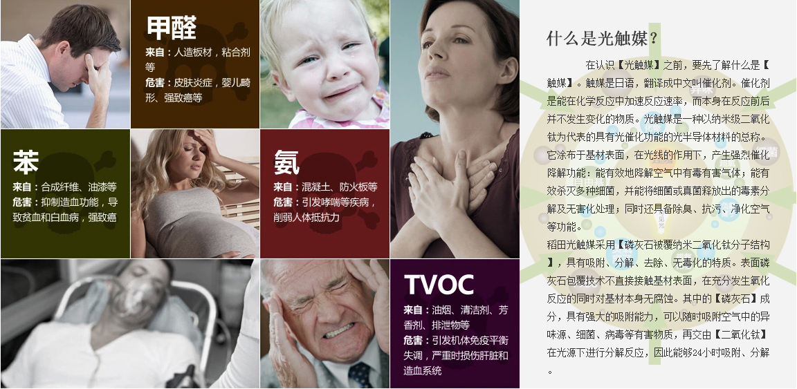 在認(rèn)識【光觸媒】之前,要先了解什么是【觸媒】。觸媒是日語,翻譯成中文叫催化劑。催化劑是能在化學(xué)反應(yīng)中加速反應(yīng)速率,而本身在反應(yīng)前后并不發(fā)生變化的物質(zhì)。光觸媒是一種以納米級二氧化鈦為代表的具有光催化功能的光半導(dǎo)體材料的總稱。它涂布于基材表面,在光線的作用下,產(chǎn)生強(qiáng)烈催化降解功能:能有效地降解空氣中有毒有害氣體;能有效殺滅多種細(xì)菌,并能將細(xì)菌或真菌釋放出的毒素分解及無害化處理;同時(shí)還具備除臭、抗污、凈化空氣等功能。 稻田光觸媒采用【磷灰石被覆納米二氧化鈦分子結(jié)構(gòu)】,具有吸附、分解、去除、無毒化的特質(zhì)。表面磷灰石包覆技術(shù)不直接接觸基材表面,在充分發(fā)生氧化反應(yīng)的同時(shí)對基材本身無腐蝕。其中的【磷灰石】成分,具有強(qiáng)大的吸附能力,可以隨時(shí)吸附空氣中的異味源、細(xì)菌、病毒等有害物質(zhì),再交由【二氧化鈦】在光源下進(jìn)行分解反應(yīng),因此能夠24小時(shí)吸附、分解